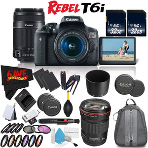 Packing a high resolution 24.2-megapixel CMOS sensor and the DIGIC 6 Image Processor into a compact body is the EOS Rebel T6i DSLR Camera with 18-55mm Lens from Canon, which includes a versatile standard zoom lens useful for stills and video. This system enables shooting in a wide variety of conditions, from bright sunlight to dim indoor scenarios due to ISO performance of up to 12,800, which can be expanded to 25,600. The APS-C camera also has built-in Wi-Fi connectivity with NFC that allows for wireless transfer of images and video to social networks and cloud storage via the Camera Connect mobile app. Product Highlights: 24.2MP APS-C CMOS Sensor DIGIC 6 Image Processor 3.0" 1.04m-dot Vari-Angle Touchscreen Full HD 1080p Video Recording at 30 fps 19-Pt. Cross-Type AF, Hybrid CMOS AF III Expanded ISO 25600, 5 fps Shooting 7560-Pixel RGB+IR Metering Sensor EOS Scene Analysis Built-In Wi-Fi Connectivity with NFC EF-S 18-55mm f/3.5-5.6 IS STM Lens This 6AVE Bundle includes: 1 x Canon EOS Rebel T6i DSLR Camera with 18-55mm Lens 1 x Canon EF-S 55-250mm f/4-5.6 IS STM Lens 1 x Canon EF 135mm f/2L USM Lens 1 x Lens Cleaning Solution1 x Blower Brush1 x Lens Tissue Paperx 5pc Cotton Swabs 1 x Universal 3 Piece Digital Gray Balance Cards Set 1 x High Quality Dust Blower 1 x Lens Pen Cleaner 1 x 58mm +1 +2 +4 +10 Close-Up Macro Filter Set with Pouch (More Macro with ANY Lens!) 1 x MicroFiber Cloth 1 x Deluxe SLR Backpack (Padded Compartments Carry All Your Gear Safely!) 2 x 32GB SDHC Class 10 Secure Digital High Speed Memory Card 1 x USB SDHC Card Reader 1 x 58mm 3 Piece Filter Kit Includes: UV, Circular Polarizer and Fluorescent Filter and Hard Case 2 x Extra LP-E17 Battery For Canon 1 x 6-Piece 58mm Graduated Color Filter Kit