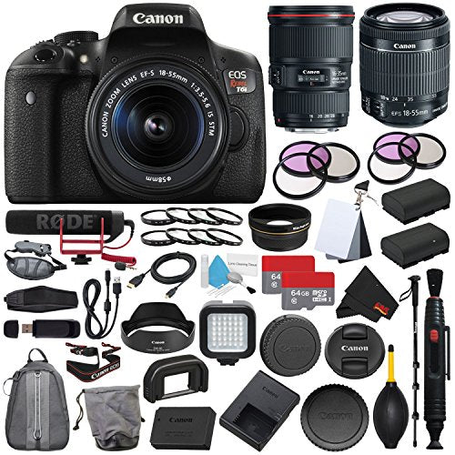 Product Highlights: 24.2MP APS-C CMOS Sensor DIGIC 6 Image Processor 3.0" 1.04m-dot Vari-Angle Touchscreen Full HD 1080p Video Recording at 30 fps 19-Pt. Cross-Type AF, Hybrid CMOS AF III Expanded ISO 25600, 5 fps Shooting 7560-Pixel RGB+IR Metering Sensor EOS Scene Analysis Built-In Wi-Fi Connectivity with NFC EF-S 18-55mm f/3.5-5.6 IS STM Lens This 6AVE Bundle includes: 1- Canon EOS Rebel T6i DSLR Camera with EF-S 18-55mm f/3.5-5.6 IS STM Lens 0591C0031- Canon EF 16-35mm f/4L IS USM Lens1- Rode VideoMic GO1- 58mm 0.45x Wide Angle Lens w/ Pouch and Caps (Capture That View!)1- 58mm 3 Piece Filter Kit Includes: UV, Circular Polarizer and Flourescent Filter and Hard Case1- 58mm +1 +2 +4 +10 Close-Up Macro Filter Set with Pouch (More Macro with ANY Lens!)1- 77mm 3 Piece Filter Kit Includes: UV, Circular Polarizer and Flourescent Filter and Hard Case1- 77mm +1 +2 +4 +10 Close-Up Macro Filter Set with Pouch (More Macro with ANY Lens!)2- LP-E17 Lithium Ion Replacement Rechargeable Battery (Not Original Canon)(Don't Miss out on a Memory!)1- Lens Cleaning Solution1- Blower Brush1- Microfiber Cloth1- Lens Tissue Paper1- 5pc Cotton Swabs1- Lens Pen Cleaner1- High Quality Dust Blower1- MicroFiber Cloth 1- SLR/DSLR Pro Hand Camera Grip1- Camera Neck Strap2- SanDisk 64GB Extreme PRO SDXC UHS-I Memory Card1- USB SDHC Card Reader1- 6 Foot High Performance Mini HDMI Cable 1- 70in Monopod1- Universal 3 Piece Digital Grey Balance Cards Set1- Deluxe SLR Backpack (Padded Compartments Carry All Your Gear Safely!)1- LED Video Light w/ Bracket