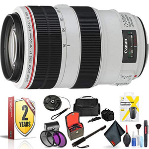 Canon'EF 70-300mm f/4-5.6L IS USM Lens OverviewSpanning a flexible range of telephoto focal lengths, the'EF 70-300mm f/4-5.6L IS USM'is a'Canon'L-series lens characterized by its relatively compact size and versatility. Two ultra-low dispersion elements are used to greatly reduce color fringing and chromatic aberrations throughout the zoom range for high clarity and color accuracy, and a Super Spectra coating has also been applied to suppress flare and ghosting for improved contrast. Also, a floating elements mechanism is employed to maintain consistent image quality throughout the focusing range for notable sharpness from 3.9' to infinity.What's In The BoxEF-Mount Lens/Full-Frame FormatAperture Range: f/4 to f/45Two Ultra-Low Dispersion ElementsSuper Spectra and Fluorine CoatingsRing-Type Ultrasonic Motor AF SystemOptical Image StabilizerFloating Focusing MechanismWeather-Sealed ConstructionRounded 8-Blade DiaphragmExtra Bundle Items:1 x Padded Carrying Case (Protect Your Gear!)1 x Lens Pouch Sleeve (for Medium Sized Lenses)1 x 67mm 3 Piece Filter Kit Includes: UV, Circular Polarizer and Fluorescent Filter and Hard Case1 x Lens Pen Cleaner1 x High Quality Dust Blower1 x Lens Cleaning Solution1 x Blower Brush1 x Lens Tissue Paper5 x Cotton Swabs1 x Deluxe 70" Monopod1 x Lens Cap Keeper (Dont Lose your Caps!)1 x MicroFiber Cloth1 x Large Cleaning Bottle for LCD Monitors2 Year Extended Warranty Included (Replaces Manufacturer Warranty)