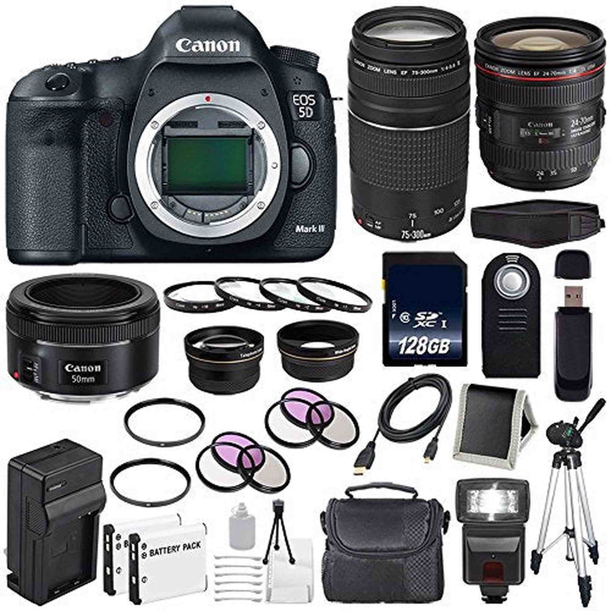 This 6AVE Bundle includes:1- Canon EOS 5DS R DSLR Camera (Body Only) w/ All Manufacturer Accessorie1- Canon EF 24-70mm f/4L IS USM Lens w/ All Manufacturer Accessories1- Canon EF 75-300mm f/4-5.6 III Telephoto Zoom Lens Brand New USA w/Manufacturer's Supplied Accessories1 - Canon EF 50mm f/1.8 STM Lens Brand New USA w/Manufacturer's Supplied Accessories2- LP-E6 Lithium Ion Replacement Rechargeable Battery (Not Original Canon)(Don't Miss out on a Memory!)1- External Rapid Quick, Travel Charger w/ Car Charger Attachment (Always Have an Extra Battery on Deck!)1- 128GB SDXC Class 10 Secure Digital High Speed Memory Card1- 58mm +1 +2 +4 +10 Close-Up Macro Filter Set with Pouch (More Macro with ANY Lens!)1- 58mm 0.45x Wide Angle Lens w/ Pouch and Caps (Capture That View!)1- 58mm 2x Telephoto Lens W/ Pouch and Caps (More Zoom better!)1- 58mm 3 Piece Filter Kit Includes: UV, Circular Polarizer and Flourescent Filter and Hard Case1- 58mm Ultraviolet UV Filter (Glare Not Your Friend!)1- 52mm Ultraviolet UV Filter (Glare Not Your Friend!)1- 77mm 3 Piece Filter Kit Includes: UV, Circular Polarizer and Flourescent Filter and Hard Case1- Padded Carrying Case (Protect Your Investment!)1- Full Size 57" Tripod W/Carry Bag (Keep it Steady!)1- SLR/DSLR Pro Hand Camera Grip1- Wireless Universal Shutter Release Remote 1- 6 Foot High Performance Mini HDMI Cable 1- Memory Card Wallet (Keep your memories safe!)1- USB SD Card Reader1- Pack of LCD Screen Protectors (Protect your LCD!) 1- Lens/LCD Maintenance Cleaning Kit 1- Mini Table Top Tripod