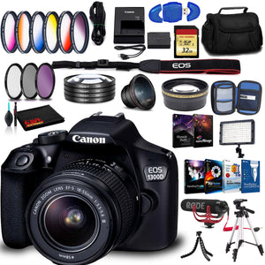 The Canon EOS 1300D with EF-S 18-55mm f/3.5-5.6 IS II Lens is an ideal camera for those looking to get into digital SLR photography, and the addition of Wi-Fi and NFC makes it an obvious choice for novice and intermediate photographers. It features everything you need to get started, and you can add extra lenses and accessories as your skill and confidence improves. The Canon EOS 1300D with EF-S 18-55mm f/3.5-5.6 IS II lens kit is also a particularly good choice, as the 4-stop image stabilisation it offers means you can use shutter speeds of up to 4 times slower, without any apparent increase in image blurring - so is ideally suited for capturing images in low-light conditions.Manufacturer Items Included:Canon EOS 1300D with EF-S 18-55mm f/3.5-5.6 IS II LensEyecup EfCamera Strap EW-400DBattery Pack LP-E10Battery CoverBattery Charger LC-E10Power Cable for Battery ChargerInterface Cable IFC-130UUser Manual KitBundle Items Include:1 x Canon EOS 1300D with EF-S 18-55mm f/3.5-5.6 IS II Lens1 x Rode VideoMicro Compact On-Camera Microphone 1 x Pinnacle Studio 22 Ultimate Video Editing Suite for PCPhotoMirage Photo Animation Sofware Suite1 x Pro 160-LED Video Light1 x Vivitar 58mm Graduated Color Filter Kit1 x Corel Productivity Software Suite Including, PaintShop Pro 2018, Winzip File Utility Manager, Corel Wordperfect Office X8 Standard, Corel PDF Fusion1 x Full Size Deluxe Tripod1 x 58mm 4-Piece +1 +2 +4 +10 Close-Up Macro Filter Set with Case1 x Padded Deluxe Carrying Case w/Strap1 x 58Mm 2X Telephoto Lens1 x 58MM Wide Angle Lens1 x Secure Digital High Speed 32GB Memory Card1 x Tabletop Tripod1 x 58MM 3Pc Filter Kit1 x Lens Cleaning Solution1 x Cleaning Cloth1 x Dust Blower1 x Lens Pen1 x Memory Card Wallet1 x USB Card Reader1 x Microfiber Cloth