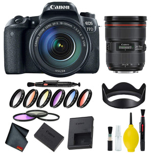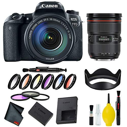 Comprising a versatile feature-set for both still photography and video recording, the EOS 77D DSLR from Canon blends advanced imaging capabilities with an intuitive design. Revolving around a 24.2MP APS-C CMOS sensor and DIGIC 7 image processor, images can be recorded using a broad native sensitivity range of ISO 100-25600, to suit shooting in a variety of lighting conditions, and a continuous shooting rate of 6 fps benefits working with moving subjects. The sensor's design also facilitates Dual Pixel CMOS AF, which uses phase-detection autofocus for quick, accurate, and smooth performance to suit both video shooting and stills use in live view. Alternatively, a 45-point all cross-type phase-detect AF system is also featured for shooting stills using the optical pentamirror viewfinder.Bundle Items Include:Canon EOS 77D DSLR CameraEF-S 18-135mm f/3.5-5.6 IS USM LensLP-E17 Lithium-Ion Battery PackLC-E17 Charger for LP-E17 Battery PackEyecup Ef for Digital Rebel CamerasRF-3 Body Cap for Canon EOS CamerasEW-100DB V Wide Camera Strap for Canon T6sCanon EF 24-70mm f/2.8L II USM Lens67mm Graduated Color Multicoated 6pcs Filter Set67mm 3 piece Lens Filter Kit (UV, Circular Polarizer, FLD)82mm UV Filter Lens Pen Cleaner5 Piece Lens Cleaning KitMicrofiber Cloth