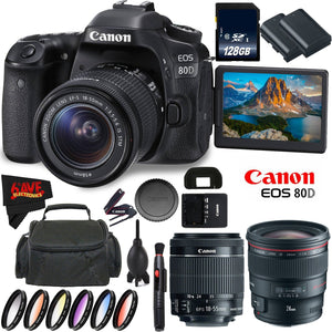 Characterized by versatile imaging specs, the Canon EOS 80D further clarifies itself using a pair of robust focusing systems and an intuitive design. Featuring a 24.2MP APS-C CMOS sensor and DIGIC 6 image processor, this sleek DSLR is capable of capturing high-resolution images at up to 7 fps and Full HD 1080p60 video, both with reduced noise and high sensitivity up to an expanded ISO 25600 for working in difficult lighting conditions. When working with the optical viewfinder, an apt 45-point all cross-type AF system affords fast performance in a range of lighting conditions for tracking moving subjects and working in low light, while the Dual Pixel CMOS AF system benefits live view Shoot-ing and movie recording by providing a smooth, natural focusing quality akin to the way a camcorder acquires focus. Touch-to-focus is availed by the large 3.0" 1.04m-dot touchscreen LCD, which also sports a swiveling vari-angle design for working from high and low angles with ease. Product Highlights: 24.2MP APS-C CMOS Sensor DIGIC 6 Image Processor 3.0" 1.04m-Dot Vari-Angle Touchscreen Full HD 1080p Video Recording at 60 fps 45-Point All Cross-Type AF System Dual Pixel CMOS AF Expanded ISO 25600, Up to 7 fps Shoot-ing Built-In Wi-Fi with NFC RGB+IR 7560-Pixel Metering Sensor EF-S 18-55mm f/3.5-5.6 IS STM Lens This 6AVE Bundle includes: 1 x Canon EOS 80D DSLR Camera with 18-55mm Lens1-Canon EF 24mm f/1.4L II USM Lens1 x Lens Cleaning Solution1 x Blower Brush1 x Microfiber Cloth1 x Lens Tissue Paper1 x 5pc Cotton Swabs1 x High Quality Dust Blower1 x Lens Pen Cleaner1 x MicroFiber Cloth 1 x Padded Carrying Case (Protect Your Investment!)1 x 128GB SDXC Class 10 Secure Digital High Speed Memory Card1 x LP-E6N Lithium-Ion Battery Pack (7.2V, 1900mAh)1 x 6 Piece 58mm Graduated Color Filter Kit