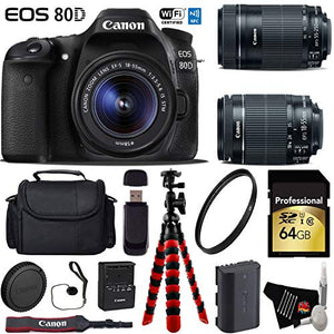 Product Highlights: 24.2MP APS-C CMOS Sensor DIGIC 6 Image Processor 3.0" 1.04m-Dot Vari-Angle Touchscreen Full HD 1080p Video Recording at 60 fps 45-Point All Cross-Type AF System Dual Pixel CMOS AF Expanded ISO 25600, Up to 7 fps Shooting Built-In Wi-Fi with NFC RGB+IR 7560-Pixel Metering Sensor Canon EOS 80D Overview: Characterized by versatile imaging specs, the Canon EOS 80D further clarifies itself using a pair of robust focusing systems and an intuitive design. Featuring a 24.2MP APS-C CMOS sensor and DIGIC 6 image processor, this sleek DSLR is capable of capturing high-resolution images at up to 7 fps and Full HD 1080p60 video, both with reduced noise and high sensitivity up to an expanded ISO 25600 for working in difficult lighting conditions. Bundle Includes: Canon EOS 80D DSLR Camera Canon EF-S 18-55mm f/3.5-5.6 IS STM Lens Canon EF-S 55-250mm IS STM Lens UV Protection Filter 64GB SDXC Class 10 Secure Digital High Speed Memory Card Deluxe Digital Camera/Video Padded Carrying Case Flexible Tripod Lens Cap Keeper High-Speed Card Reader Lens Tissue Paper Cotton Swabs Lens Cleaning Solution 6 Ave MicroFiber Cloth In the Box: LP-E6N Lithium-Ion Battery Pack LC-E6 Charger EW-EOS80D Wide Strap Eyecup Eb RF-3 Body Cap Brand New. Includes Manufacturer's Supplied Accessories & One Year Seller Supplied Warranty.
