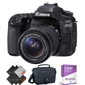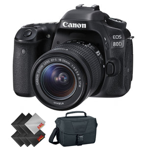 Canon EOS 80D DSLR Camera with 18-55mm Lens Overview:Characterized by versatile imaging specs, the Canon EOS 80D further clarifies itself using a pair of robust focusing systems and an intuitive design. Featuring a 24.2MP APS-C CMOS sensor and DIGIC 6 image processor, this sleek DSLR is capable of capturing high-resolution images at up to 7 fps and Full HD 1080p60 video, both with reduced noise and high sensitivity up to an expanded ISO 25600 for working in difficult lighting conditions. When working with the optical viewfinder, an apt 45-point all cross-type AF system affords fast performance in a range of lighting conditions for tracking moving subjects and working in low light, while the Dual Pixel CMOS AF system benefits live view shooting and movie recording by providing a smooth, natural focusing quality akin to the way a camcorder acquires focus. Touch-to-focus is availed by the large 3.0" 1.04m-dot touchscreen LCD, which also sports a swiveling vari-angle design for working from high and low angles with ease.24.2MP APS-C CMOS SensorDIGIC 6 Image Processor3.0" 1.04m-Dot Vari-Angle TouchscreenFull HD 1080p Video Recording at 60 fpsWhat's In The Box:Canon EOS 80D DSLR Camera with 18-55mm LensEF-S 18-55mm f/3.5-5.6 IS STM LensLP-E6N Lithium-Ion Battery Pack (7.2V, 1865mAh)LC-E6 Charger for LP-E6 Battery PackEW-EOS80D Wide Camera StrapEyecup EbRF-3 Body Cap for Canon EOS CamerasLimited 1-Year WarrantyItems Included With Your Purchase:1 x Fibercloth 1 x Camera Cleaning Kit 1 x Memory Card Wallet 1 X Lens Cap Keeper