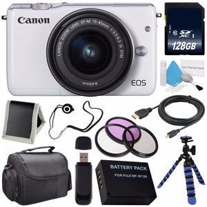 The M3 features an advanced Hybrid CMOS AF III autofocus system which focuses up to 6.1x faster than the EOS M in part due to the 49 phase-detect points that cover 80% of the vertical frame and 70% of the horizontal frame. Creative assist allows you to preview camera adjustments in real time, letting you save and share your chosen settings. Additionally, a front dial and an exposure compensation dial permit full manual control over the camera's settings. Built-in Wi-Fi and NFC connectivity make sending and sharing your images an easy task.A standard zoom covering wide-angle to short telephoto perspectives, Canon EF-M 15-45mm f/3.5-6.3 IS STM Lens offers a 24-72mm equivalent focal length range when used with APS-C-format EOS M-series mirrorless cameras. The optical design incorporates three aspherical elements, one of which is glass-molded and the other two are precision molded, in order to control chromatic aberrations and distortions throughout the zoom range.This 6AVE Bundle includes:1- Canon EOS M3 Mark III 24.2 Mp Mirrorless Camera w/ 15-45 STm Lens (White) 1- 49mm 3 Piece Filter Kit Includes: UV, Circular Polarizer and Flourescent Filter and Hard Case1- LP-E17 Lithium Ion Replacement Rechargeable Battery (Not Original Canon)(Don't Miss out on a Memory!)1- 128GB SDXC Class 10 Secure Digital High Speed Memory Card1- USB SDHC Card Reader1- 6 Foot High Performance Mini HDMI Cable 1- Padded Carrying Case (Protect Your Investment!)1- Memory Card Wallet (Keep your memories safe!)1- Lens Cap Keeper (Dont Lose your Caps!) 1- Flexible Tripod with Gripping Rubber Legs1- Lens Cleaning Solution1- Blower Brush1- Microfiber Cloth1- Lens Tissue Paper1- 5pc Cotton Swabs