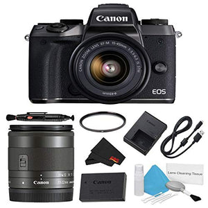 Adept in both stills and video arenas, the EOS M5 from Canon is a versatile mirrorless camera featuring a 24.2MP APS-C CMOS sensor and DIGIC 7 image processor. Combined, these technologies afford a wide sensitivity range, from ISO 100-25600, along with quick performance for up to 9 fps continuous shooting and Full HD 1080p/60 video recording. The sensor's design also provides Dual Pixel CMOS AF, which offers quick and accurate phase-detection autofocus for multimedia use. This focusing system is particularly well-suited to subject tracking, and pairs with Digital IS 5-axis image stabilization for steadier, shake-free video recording. Complementing the imaging capabilities, the camera's design is equally versatile due to the inclusion of both a 2.36m-dot electronic viewfinder along with a large 3.2" 1.62m-dot LCD tilting touchscreen. The touchscreen design enables Touch and Drag AF for intuitive focusing point control, and an array of additional physical dials and control buttons provide an efficient means for settings changes. Additionally, the camera sports built-in Wi-Fi with NFC for quick and convenient pairing with a smartphone or tablet for wireless image sharing, and Bluetooth is also featured for image sharing to and remote camera control from a mobile device.Bundle Items Include:Canon EOS M5 Mirrorless Digital Camera with EF-M 15-45mm f/3.5-6.3 IS STM Lens (Graphite) - International ModelR-F-4 Camera Cover (Body Cap) for EOS M Mirrorless CameraEM-300DB StrapLP-E17 Lithium-Ion Battery PackLC-E17 Charger for LP-E17 Battery PackTerminal CoverIFC-600PCU Interface Cable (3.3')Canon EF-M 11-22MM f/ 4-5.6 IS STM - International Model55mm UV Filter Lens Pen Cleaner5 Piece Lens Cleaning KitMicrofiber Cloth