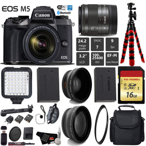 Product Highlights: 24.2MP APS-C CMOS Sensor DIGIC 7 Image Processor 2.36m-Dot EVF, Touch and Drag AF Control 3.2" 1.62m-Dot Tilting Touchscreen LCD Full HD 1080p Video Recording at 60 fps Built-In Wi-Fi with NFC, Bluetooth Dual Pixel CMOS AF Canon EOS M5 Mirrorless Digital Camera Overview: Adept in both stills and video arenas, the EOS M5 from Canon is a versatile mirrorless camera featuring a 24.2MP APS-C CMOS sensor and DIGIC 7 image processor. Combined, these technologies afford a wide sensitivity range, from ISO 100-25600, along with quick performance for up to 9 fps continuous shooting and Full HD 1080p/60 video recording. Bundle Includes: Canon EOS M5 Mirrorless Digital Camera Canon EF-M 15-45mm f/3.5-6.3 IS STM Lens LED Camera Video Light Continuous Panel Light On Camera UV Protection Lens 0.43x High Definition Wide Angle Conversion Lens 2.2x Telephoto Conversion Lens 16GB SDXC Class 10 Secure Digital High Speed Memory Card Replacement Battery For LP-E17 Lithium-Ion Battery Pack Wrist Strap Deluxe Digital Camera Case Flexible Tripod Lens Cap Keeper High-Speed Card Reader Lens Tissue Paper Cotton Swabs Lens Cleaning Solution 6 Ave MicroFiber Cloth In the Box: LP-E17 Lithium-Ion Battery Pack LC-E17 Charger R-F-4 Camera Cover (Body Cap) EM-300DB Strap Terminal Cover IFC-600PCU Interface Cable (3.3') Brand New. Includes Manufacturer's Supplied Accessories & One Year Seller Supplied Warranty.