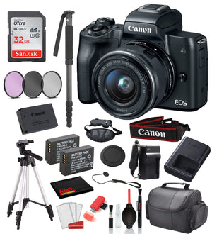 Canon EOS M50 Mirrorless Digital Camera with 15-45mm Lens (Black) Bundle + SanDisk 32gb SD + 57+ Tripod + MORE