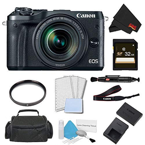 A well-rounded mirrorless camera for both stills and video use, the black EOS M6 from Canon offers apt imaging qualities with a refined, functional physical design. Making use of a 24.2MP APS-C CMOS sensor, both high-resolution stills and Full HD 1080p/60 video can be recorded, while the DIGIC 7 image processor affords a wide expanded sensitivity range from ISO 100-25600, along with quick continuous shooting up to 9 fps. The sensor's design also facilitates Dual Pixel CMOS AF, which uses phase-detection autofocus for quick, accurate, and smooth performance to suit both stills and video use. Additionally, Combination IS 5-axis image stabilization also helps to realize steady, shake-free recording by minimizing the appearance of camera shake. Alongside the imaging attributes, the EOS M6 also incorporates a large 3.0" 1.04m-dot touchscreen LCD for intuitive control, and the screen's design tilts to enable easier shooting from high and low working angles. Additionally, built-in Wi-Fi with NFC is available for quick and convenient pairing with a smartphone or tablet for wireless image sharing, and Bluetooth is also featured for image sharing to and remote camera control from a mobile device.Bundle Items Include:Canon EOS M6 Mirrorless Digital Camera (Black) with EF-M 18-150mm f/3.5-6.3 IS STM Lens (Graphite) - International ModelLP-E17 Lithium-Ion Battery PackLC-E17 Charger for LP-E17 Battery PackR-F-4 Camera Cover (Body Cap) for EOS M Mirrorless CameraEM-300DB StrapTerminal Cover32GB UHS-I SDXC Memory Card (Class 10)Padded Deluxe Carrying Case w/Strap55mm UV Filter Lens Pen Cleaner5 Piece Lens Cleaning KitLCD Screen ProtectorsMicrofiber Cloth