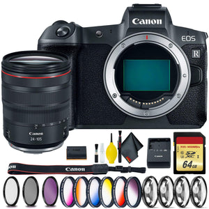 Canon EOS R Mirrorless Digital Camera Overview:The first step in Canon's mirrorless evolution, the EOS R pairs a redeveloped lens mount and updated full-frame image sensor for a unique and sophisticated multimedia camera system. Revolving around the new RF lens mount, the EOS R is poised to be the means from which to make the most of a new series of lenses and optical technologies. Focusing on the camera itself, the EOS R features a high-resolution 30.3MP full-frame CMOS sensor along with a DIGIC 8 image processor. The combination of these technologies offers a wide sensitivity range up to a native ISO 40000, fast continuous shooting to 8 fps, and UHD 4K30 video recording. 30.3MP Full-Frame CMOS SensorDIGIC 8 Image ProcessorUHD 4K30 Video; C-Log & 10-Bit HDMI OutDual Pixel CMOS AF, 5655 AF Points3.69m-Dot OLED Electronic Viewfinder3.15" 2.1m-Dot Swivel Touchscreen LCDExpanded ISO 50-102400, 8 fps ShootingWi-Fi and Bluetooth, SD UHS-II Card SlotItems Included With Your Purchase:1 x Canon EOS R Mirrorless Digital Camera with 24-105mm Lens 1 x High Quality Dust Blower 1 x MicroFiber Cloth 1 x Lens Cleaning Solution1 x Blower Brush1 x Lens Tissue Paper5 x Cotton Swabs 1 x Lens Pen Cleaner 1 x 64GB Memory Card 1 x 6-Piece 77mm Graduated Color Filter Kit 1 x 77mm 3 Piece Filter Kit Includes: UV, Circular Polarizer and Fluorescent Filter and Hard Case 1 x 77mm +1 +2 +4 +10 Close-Up Macro Filter Set with Pouch 1 x Deluxe SLR Backpack 1 x LP-E6N Lithium-Ion Battery Pack 1 x LC-E6 Battery Charger 1 x ER-100B Neck Strap 1 x Cable Protector 1 x IFC-100U Interface Cable 1 x R-F-5 Camera Cover