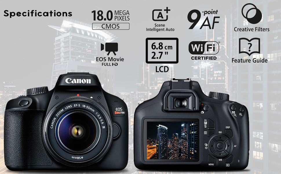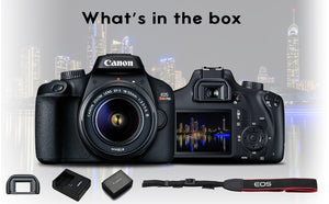 Tell distinctive stories with your photography. This beginner’s DSLR intuitively creates stand-out photos and Full HD movies full of colour and detail – offering partial and full manual photographic control, whenever you’re ready. The 18 Megapixel APS-C sensor allows you to shoot in low light and create beautiful background blur, effortlessly expressing your creativity with interchangeable lenses. Point and snap with Scene Intelligent Auto, whilst Creative Auto mode, in-camera Feature Guide and Canon’s Photo Companion app provide helpful tips and direction on your photographic journey. Shoot and share your stories as you grow using EOS 4000D’s built-in Wi-Fi¹ with the downloadable Camera Connect app. This Kit Includes: Canon EOS 4000D DSLR Camera with EF-S 18-55mm f/3.5-5.6 III Lens Manufacturer Accessories LP-E10 Lithium-Ion Battery Pack LC-E10 Battery Charger for EOS Rebel T3, T5, T6 Eyecup EF RF-3 Body Cap for Canon EOS Cameras EW-400D Neck Strap Battery Cover Bundle Items Include:1 x Full Size Deluxe Tripod1 x Universal Digital Camera Flash1 x Deluxe Sling Backpack1 x 58MM Wide Angle Lens1 x 58Mm 2X Telephoto Lens1 x Secure Digital High Speed 32GB Memory Card1 x 58MM 3Pc Filter Kit1 x Pro Hand Camera Grip1 x 58mm Tulip Lens Hood1 x Lens Cleaning Solution , Cleaning Cloth , Dust Blower , Lens Pen1 x Memory Card Wallet1 x USB Card Reader1 x Lens Cap Keeper