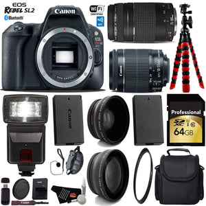 Product Highlights: 24.2MP APS-C CMOS Sensor DIGIC 7 Image Processor 3" 1.04m-Dot Vari-Angle Touchscreen LCD Full HD 1080p Video Recording at 60 fps 9-Point AF System; Dual Pixel CMOS AF Native ISO 25600, Extended to ISO 51200 Up to 5 fps Continuous Shooting Feature Assistant; Microphone Input Canon EOS Rebel SL2 Overview: With a compact and lightweight body, the black Canon EOS Rebel SL2 DSLR Camera provides users with a fully-featured system that won't weigh them down. Packed into the tiny body is a capable 24.2MP APS-C CMOS sensor and a DIGIC 7 Image Processor, both of which work together to create sharp, vivid images at native sensitivities up to ISO 25600 and extended sensitivities up to ISO 51200. Video shooting has received a boost with Full HD 1080p recording possible at up to 60 fps. Bundle Includes: Canon EOS Rebel SL2 DSLR Camera Canon EF-S 18-55mm f/4-5.6 IS STM Lens Canon EF 75-300mm f/4-5.6 III Lens Replacement Battery Professional Flash UV Protection Lens 0.43x High Definition Wide Angle Conversion Lens 2.2x Telephoto Conversion Lens 64GB SDXC Class 10 Secure Digital High Speed Memory Card Wrist Strap Deluxe Digital Camera/Video Padded Carrying Case Flexible Tripod Lens Cap Keeper High-Speed Card Reader Lens Tissue Paper Cotton Swabs Lens Cleaning Solution 6 Ave MicroFiber Cloth In the Box: LP-E17 Battery Pack LC-E17 Charger Eyecup EF RF-3 Body Cap EW-400D Wide Strap Brand New. Includes Manufacturer's Supplied Accessories & One Year Seller Supplied Warranty.