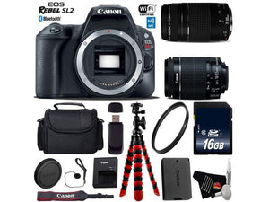 Product Highlights: 24.2MP APS-C CMOS Sensor DIGIC 7 Image Processor 3" 1.04m-Dot Vari-Angle Touchscreen LCD Full HD 1080p Video Recording at 60 fps 9-Point AF System; Dual Pixel CMOS AF Native ISO 25600, Extended to ISO 51200 Up to 5 fps Continuous Shooting Feature Assistant; Microphone Input Built-In Wi-Fi with NFC and Bluetooth Canon EOS Rebel SL2 Overview: With a compact and lightweight body, the black Canon EOS Rebel SL2 DSLR Camera provides users with a fully-featured system that won't weigh them down. Packed into the tiny body is a capable 24.2MP APS-C CMOS sensor and a DIGIC 7 Image Processor, both of which work together to create sharp, vivid images at native sensitivities up to ISO 25600 and extended sensitivities up to ISO 51200. Video shooting has received a boost with Full HD 1080p recording possible at up to 60 fps. Bundle Includes: Canon EOS Rebel SL2 DSLR Camera Canon EF-S 18-55mm f/4-5.6 IS STM Lens Canon EF 75-300mm f/4-5.6 III Lens UV Protection Filter 16GB SDXC Class 10 Secure Digital High Speed Memory Card Deluxe Digital Camera/Video Padded Carrying Case Flexible Tripod Lens Cap Keeper High-Speed Card Reader Lens Tissue Paper Cotton Swabs Lens Cleaning Solution 6 Ave MicroFiber Cloth In the Box: LP-E17 Battery Pack LC-E17 Charger Eyecup EF RF-3 Body Cap EW-400D Wide Strap Brand New. Includes Manufacturer's Supplied Accessories & One Year Seller Supplied Warranty.