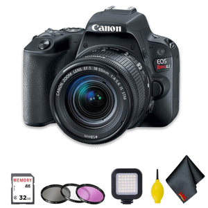 The black'Canon EOS Rebel SL2 DSLR Camera'provides users with a fully-featured system that won't weigh them down. Packed into the tiny body is a capable 24.2MP APS-C CMOS sensor and a DIGIC 7 Image Processor, both of which work together to create sharp, vivid images at native sensitivities up to ISO 25600 and extended sensitivities up to ISO 51200. Video shooting has received a boost with Full HD 1080p recording possible at up to 60 fps. The SL2 also manages some significant body upgrades, with the main addition being a 3.0" vari-angle touchscreen LCD for intuitive operation and the ability to work at odd angles with relative ease.As a DSLR, the SL2 obviously retains the optical viewfinder for fast, natural composition of your images and it can shoot continuously at speeds up to 5 fps. This setup also features a 9-point AF system for capturing tack sharp images. If you are working in Live View or shooting video, the SL2 does offer Dual Pixel CMOS AF technology, providing fast, accurate focusing in these modes and with intuitive control via the touchscreen. Additionally, the SL2 has a microphone input for higher quality audio recording during movie shooting.This Bundle Includes:1 x Canon'EOS Rebel SL2 DSLR Camera with 18-55mm Lens1 x 32GB SDHC Memory Card 1 x Filter Kit for 58mm1 x Mini Portable LED Light 1 x Microfiber Cloth1 x Dust Blower