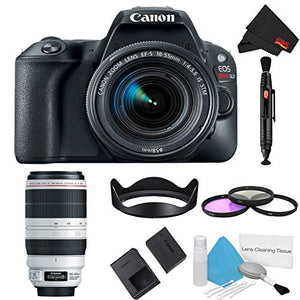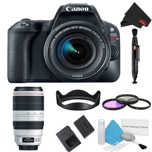 With a compact and lightweight body, the black Canon EOS Rebel SL2 DSLR Camera provides users with a fully-featured system that won't weigh them down. Packed into the tiny body is a capable 24.2MP APS-C CMOS sensor and a DIGIC 7 Image Processor, both of which work together to create sharp, vivid images at native sensitivities up to ISO 25600 and extended sensitivities up to ISO 51200. Video shooting has received a boost with Full HD 1080p recording possible at up to 60 fps. The SL2 also manages some significant body upgrades, with the main addition being a 3.0" vari-angle touchscreen LCD for intuitive operation and the ability to work at odd angles with relative ease. As a DSLR, the SL2 obviously retains the optical viewfinder for fast, natural composition of your images and it can shoot continuously at speeds up to 5 fps. This setup also features a 9-point AF system for capturing tack sharp images. If you are working in Live View or shooting video, the SL2 does offer Dual Pixel CMOS AF technology, providing fast, accurate focusing in these modes and with intuitive control via the touchscreen. Additionally, the SL2 has a microphone input for higher quality audio recording during movie shooting. Bundle Items Include:Canon EOS Rebel SL2 DSLR Camera with EF-S 18-55mm f/4-5.6 IS STM Lens (International Model)Canon EF 100-400mm F/4.5-5.6L IS II USM Lens (International Model)LP-E17 Lithium-Ion Battery PackLC-E17 Charger for LP-E17 Battery PackEyecup Ef for Digital Rebel CamerasEW-400D Wide Strap58MM 3Pc Filter Kit77mm UV Filter58mm Tulip Lens HoodLens Pen Cleaner5 Piece Lens Cleaning KitMicrofiber Cloth