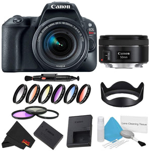 With a compact and lightweight body, the black Canon EOS Rebel SL2 DSLR Camera provides users with a fully-featured system that won't weigh them down. Packed into the tiny body is a capable 24.2MP APS-C CMOS sensor and a DIGIC 7 Image Processor, both of which work together to create sharp, vivid images at native sensitivities up to ISO 25600 and extended sensitivities up to ISO 51200. Video shooting has received a boost with Full HD 1080p recording possible at up to 60 fps. The SL2 also manages some significant body upgrades, with the main addition being a 3.0" vari-angle touchscreen LCD for intuitive operation and the ability to work at odd angles with relative ease. As a DSLR, the SL2 obviously retains the optical viewfinder for fast, natural composition of your images and it can shoot continuously at speeds up to 5 fps. This setup also features a 9-point AF system for capturing tack sharp images. If you are working in Live View or shooting video, the SL2 does offer Dual Pixel CMOS AF technology, providing fast, accurate focusing in these modes and with intuitive control via the touchscreen. Additionally, the SL2 has a microphone input for higher quality audio recording during movie shooting. Bundle Items Include:Canon EOS Rebel SL2 DSLR Camera with EF-S 18-55mm f/4-5.6 IS STM Lens (International Model)Canon EF 50mm f/1.8 STM Lens (International Model)LP-E17 Lithium-Ion Battery PackLC-E17 Charger for LP-E17 Battery PackEyecup Ef for Digital Rebel CamerasEW-400D Wide Strap58MM Graduated Color Filter Kit58MM 3Pc Filter Kit49mm UV Filter58mm Tulip Lens HoodLens Pen Cleaner5 Piece Lens Cleaning KitMicrofiber Cloth