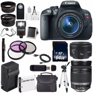 This 6AVE Bundle includes:1- Canon EOS Rebel T5i 18 MP CMOS Digital SLR Camera w/EF-S 18-55mm f/3.5-5.6 Lens Brand New w/ All Supplied Manufacturer Accessories1- Canon EF 50mm f/1.8 II SLR Lens Brand New w/Supplied Manufacturer Accessories1- Canon EF-S 18-200mm f/3.5-5.6 Standard Zoom Lens Brand New w/ Manufacturer Supplied Accessories1- 64GB SDXC Class 10 Secure Digital High Speed Memory Card1- 58mm 2x Telephoto Lens W/ Pouch and Caps (More Zoom better!)1- 58mm 0.45x Wide Angle Lens w/ Pouch and Caps (Capture That View!) 1- 58mm 3 Piece Filter Kit Includes: UV, Circular Polarizer and Flourescent Filter and Hard Case1- LP-E8 Lithium Ion Replacement Rechargeable Battery (Not Original Canon)(Don't Miss out on a Memory!)1- External Rapid Quick, Travel Charger w/ Car Charger Attachment (Always Have an Extra Battery on Deck!)1- Padded Carrying Case (Protect Your Investment!)1- Full Size Tripod W/Carry Bag (Keep it Steady!)1- Wireless Universal Shutter Release Remote 1- External Digital Slave SLR Flash (Brighten any Memory with a Flash!)1- 6 Foot High Performance Mini HDMI Cable 1- Lens Pen Cleaner1- USB SDHC Card Reader1- Memory Card Wallet (Keep your memories safe!)1- Lens Cap Keeper (Dont Lose your Caps!) 1- Lens Cleaning Solution1- Blower Brush1- Microfiber Cloth1- Lens Tissue Paper1- 5pc Cotton Swabs