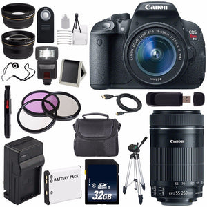 This 6AVE Bundle includes:1- Canon EOS Rebel T5i 18 MP CMOS Digital SLR Camera w/EF-S 18-55mm f/3.5-5.6 Lens Brand New w/ All Supplied Manufacturer Accessories1- Canon EF-S 55-250mm f/4-5.6 IS STM Lens Brand New w/All Manufacturer Accessories 1- 32GB SDHC Class 10 Secure Digital High Speed Memory Card1- 58mm 2x Telephoto Lens W/ Pouch and Caps (More Zoom better!)1- 58mm 0.45x Wide Angle Lens w/ Pouch and Caps (Capture That View!) 1- 58mm 3 Piece Filter Kit Includes: UV, Circular Polarizer and Flourescent Filter and Hard Case1- LP-E8 Lithium Ion Replacement Rechargeable Battery (Not Original Canon)(Don't Miss out on a Memory!)1- External Rapid Quick, Travel Charger w/ Car Charger Attachment (Always Have an Extra Battery on Deck!)1- Padded Carrying Case (Protect Your Investment!)1- Full Size Tripod W/Carry Bag (Keep it Steady!)1- Wireless Universal Shutter Release Remote 1- External Digital Slave SLR Flash (Brighten any Memory with a Flash!)1- 6 Foot High Performance Mini HDMI Cable 1- Lens Pen Cleaner1- USB SDHC Card Reader1- Memory Card Wallet (Keep your memories safe!)1- Lens Cap Keeper (Dont Lose your Caps!) 1- Lens Cleaning Solution1- Blower Brush1- Microfiber Cloth1- Lens Tissue Paper1- 5pc Cotton Swabs