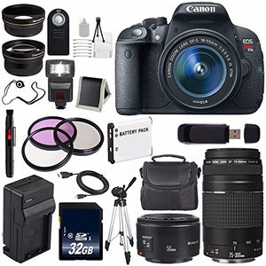 This 6AVE Bundle includes:1- Canon EOS Rebel T5i 18 MP CMOS Digital SLR Camera w/EF-S 18-55mm f/3.5-5.6 Lens Brand New w/ All Supplied Manufacturer Accessories1- Canon EF 50mm f/1.8 II SLR Lens Brand New w/Supplied Manufacturer Accessories1- Canon EF 75-300mm f/4-5.6 III Telephoto Zoom Lens Brand New w/Manufacturer's Supplied Accessories1- 32GB SDHC Class 10 Secure Digital High Speed Memory Card1- 58mm 2x Telephoto Lens W/ Pouch and Caps (More Zoom better!)1- 58mm 0.45x Wide Angle Lens w/ Pouch and Caps (Capture That View!) 1- 58mm 3 Piece Filter Kit Includes: UV, Circular Polarizer and Flourescent Filter and Hard Case1- LP-E8 Lithium Ion Replacement Rechargeable Battery (Not Original Canon)(Don't Miss out on a Memory!)1- External Rapid Quick, Travel Charger w/ Car Charger Attachment (Always Have an Extra Battery on Deck!)1- Padded Carrying Case (Protect Your Investment!)1- Full Size Tripod W/Carry Bag (Keep it Steady!)1- Wireless Universal Shutter Release Remote 1- External Digital Slave SLR Flash (Brighten any Memory with a Flash!)1- 6 Foot High Performance Mini HDMI Cable 1- Lens Pen Cleaner1- USB SDHC Card Reader1- Memory Card Wallet (Keep your memories safe!)1- Lens Cap Keeper (Dont Lose your Caps!) 1- Lens Cleaning Solution1- Blower Brush1- Microfiber Cloth1- Lens Tissue Paper1- 5pc Cotton Swabs