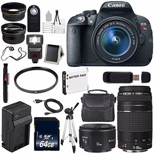 This 6AVE Bundle includes:1- Canon EOS Rebel T5i 18 MP CMOS Digital SLR Camera w/EF-S 18-55mm f/3.5-5.6 Lens Brand New w/ All Supplied Manufacturer Accessories1- Canon EF 50mm f/1.8 II SLR Lens Brand New w/Supplied Manufacturer Accessories1- Canon EF 75-300mm f/4-5.6 III Telephoto Zoom Lens Brand New w/Manufacturer's Supplied Accessories1- 64GB SDXC Class 10 Secure Digital High Speed Memory Card1- 58mm 2x Telephoto Lens W/ Pouch and Caps (More Zoom better!)1- 58mm 0.45x Wide Angle Lens w/ Pouch and Caps (Capture That View!) 1- 58mm Ultraviolet UV Filter (Glare Not Your Friend!)1- LP-E8 Lithium Ion Replacement Rechargeable Battery (Not Original Canon)(Don't Miss out on a Memory!)1- External Rapid Quick, Travel Charger w/ Car Charger Attachment (Always Have an Extra Battery on Deck!)1- Padded Carrying Case (Protect Your Investment!)1- Full Size Tripod W/Carry Bag (Keep it Steady!)1- Wireless Universal Shutter Release Remote 1- External Digital Slave SLR Flash (Brighten any Memory with a Flash!)1- 6 Foot High Performance Mini HDMI Cable 1- Lens Pen Cleaner1- USB SDHC Card Reader1- Memory Card Wallet (Keep your memories safe!)1- Lens Cap Keeper (Dont Lose your Caps!) 1- Lens Cleaning Solution1- Blower Brush1- Microfiber Cloth1- Lens Tissue Paper1- 5pc Cotton Swabs