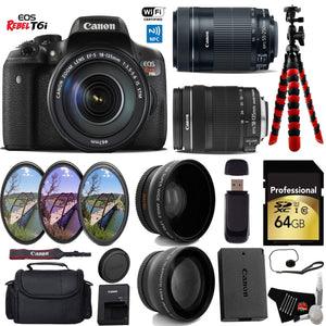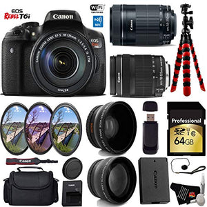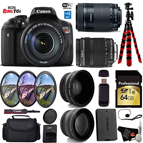 Product Highlights: 24.2MP APS-C CMOS Sensor DIGIC 6 Image Processor 3.0" 1.04m-dot Vari-Angle Touchscreen Full HD 1080p Video Recording at 30 fps 19-Pt. Cross-Type AF, Hybrid CMOS AF III Expanded ISO 25600, 5 fps Shooting 7560-Pixel RGB+IR Metering Sensor EOS Scene Analysis Built-In Wi-Fi Connectivity with NFC Canon Rebel T6i Overview: Packing a high resolution 24.2-megapixel CMOS sensor and the DIGIC 6 Image Processor into a compact body is the EOS Rebel T6i DSLR Camera from Canon. This system enables shooting in a wide variety of conditions, from bright sunlight to dim indoor scenarios due to ISO performance of up to 12,800, which can be expanded to 25,600. Bundle Includes: Canon EOS Rebel T6i DSLR Camera Canon EF-S 18-135mm f/3.5-5.6 IS STM Lens Canon EF-S 55-250mm IS STM Lens Multi-Coated 3 Piece Filter Kit (UV-CPL-FLD) 0.43x High Definition Wide Angle Conversion Lens 2.2x Telephoto Conversion Lens 64GB SDXC Class 10 Secure Digital High Speed Memory Card Deluxe Digital Camera/Video Padded Carrying Case Flexible Tripod Lens Cap Keeper High-Speed Card Reader Lens Tissue Paper Cotton Swabs Lens Cleaning Solution 6 Ave MicroFiber Cloth In the Box: LP-E17 Battery Pack LC-E17 Charger Eyecup EF RF-3 Body Cap EW-300D Wide Strap Brand New. Includes Manufacturer's Supplied Accessories & One Year Seller Supplied Warranty.