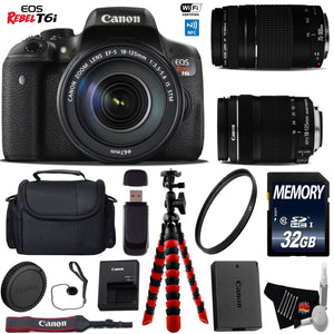Product Highlights: 24.2MP APS-C CMOS Sensor DIGIC 6 Image Processor 3.0" 1.04m-dot Vari-Angle Touchscreen Full HD 1080p Video Recording at 30 fps 19-Pt. Cross-Type AF, Hybrid CMOS AF III Expanded ISO 25600, 5 fps Shooting 7560-Pixel RGB+IR Metering Sensor EOS Scene Analysis Built-In Wi-Fi Connectivity with NFC Canon Rebel T6i Overview: Packing a high resolution 24.2-megapixel CMOS sensor and the DIGIC 6 Image Processor into a compact body is the EOS Rebel T6i DSLR Camera from Canon. This system enables shooting in a wide variety of conditions, from bright sunlight to dim indoor scenarios due to ISO performance of up to 12,800, which can be expanded to 25,600. Bundle Includes: Canon EOS Rebel T6i DSLR Camera Canon EF-S 18-135mm f/3.5-5.6 IS STM Lens Canon EF 75-300mm f/4-5.6 III Lens UV Protection Filter 32GB SDXC Class 10 Secure Digital High Speed Memory Card Deluxe Digital Camera/Video Padded Carrying Case Flexible Tripod Lens Cap Keeper High-Speed Card Reader Lens Tissue Paper Cotton Swabs Lens Cleaning Solution 6 Ave MicroFiber Cloth In the Box: LP-E17 Battery Pack LC-E17 Charger Eyecup EF RF-3 Body Cap EW-300D Wide Strap Brand New. Includes Manufacturer's Supplied Accessories & One Year Seller Supplied Warranty.
