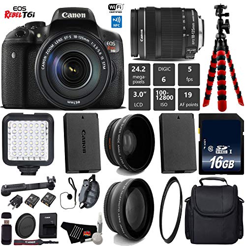 Product Highlights: 24.2MP APS-C CMOS Sensor DIGIC 6 Image Processor 3.0" 1.04m-dot Vari-Angle Touchscreen Full HD 1080p Video Recording at 30 fps 19-Pt. Cross-Type AF, Hybrid CMOS AF III Expanded ISO 25600, 5 fps Shooting 7560-Pixel RGB+IR Metering Sensor EOS Scene Analysis Built-In Wi-Fi Connectivity with NFC Canon Rebel T6i Overview: Packing a high resolution 24.2-megapixel CMOS sensor and the DIGIC 6 Image Processor into a compact body is the EOS Rebel T6i DSLR Camera from Canon. This system enables shooting in a wide variety of conditions, from bright sunlight to dim indoor scenarios due to ISO performance of up to 12,800, which can be expanded to 25,600. Bundle Includes: Canon EOS Rebel T6i DSLR Camera Canon EF-S 18-135mm f/3.5-5.6 IS STM Lens LED Camera Video Light Continuous Panel Light On Camera UV Protection Lens 0.43x High Definition Wide Angle Conversion Lens 2.2x Telephoto Conversion Lens 16GB SDXC Class 10 Secure Digital High Speed Memory Card Replacement Battery For LP-E17 Lithium-Ion Battery Pack Wrist Strap Deluxe Digital Camera Case Flexible Tripod Lens Cap Keeper High-Speed Card Reader Lens Tissue Paper Cotton Swabs Lens Cleaning Solution 6 Ave MicroFiber Cloth In the Box: LP-E17 Battery Pack LC-E17 Charger Eyecup EF RF-3 Body Cap EW-300D Wide Strap Brand New. Includes Manufacturer's Supplied Accessories & One Year Seller Supplied Warranty.