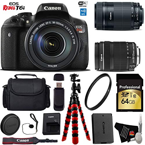 Product Highlights: 24.2MP APS-C CMOS Sensor DIGIC 6 Image Processor 3.0" 1.04m-dot Vari-Angle Touchscreen Full HD 1080p Video Recording at 30 fps 19-Pt. Cross-Type AF, Hybrid CMOS AF III Expanded ISO 25600, 5 fps Shooting 7560-Pixel RGB+IR Metering Sensor EOS Scene Analysis Built-In Wi-Fi Connectivity with NFC Canon Rebel T6i Overview: Packing a high resolution 24.2-megapixel CMOS sensor and the DIGIC 6 Image Processor into a compact body is the EOS Rebel T6i DSLR Camera from Canon. This system enables shooting in a wide variety of conditions, from bright sunlight to dim indoor scenarios due to ISO performance of up to 12,800, which can be expanded to 25,600. Bundle Includes: Canon EOS Rebel T6i DSLR Camera Canon EF-S 18-135mm f/3.5-5.6 IS STM Lens Canon EF-S 55-250mm IS STM Lens UV Protection Filter 64GB SDXC Class 10 Secure Digital High Speed Memory Card Deluxe Digital Camera/Video Padded Carrying Case Flexible Tripod Lens Cap Keeper High-Speed Card Reader Lens Tissue Paper Cotton Swabs Lens Cleaning Solution 6 Ave MicroFiber Cloth In the Box: LP-E17 Battery Pack LC-E17 Charger Eyecup EF RF-3 Body Cap EW-300D Wide Strap Brand New. Includes Manufacturer's Supplied Accessories & One Year Seller Supplied Warranty.