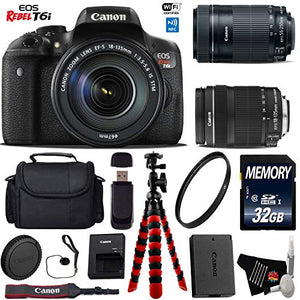 Product Highlights: 24.2MP APS-C CMOS Sensor DIGIC 6 Image Processor 3.0" 1.04m-dot Vari-Angle Touchscreen Full HD 1080p Video Recording at 30 fps 19-Pt. Cross-Type AF, Hybrid CMOS AF III Expanded ISO 25600, 5 fps Shooting 7560-Pixel RGB+IR Metering Sensor EOS Scene Analysis Built-In Wi-Fi Connectivity with NFC Canon Rebel T6i Overview: Packing a high resolution 24.2-megapixel CMOS sensor and the DIGIC 6 Image Processor into a compact body is the EOS Rebel T6i DSLR Camera from Canon. This system enables shooting in a wide variety of conditions, from bright sunlight to dim indoor scenarios due to ISO performance of up to 12,800, which can be expanded to 25,600. Bundle Includes: Canon EOS Rebel T6i DSLR Camera Canon EF-S 18-135mm f/3.5-5.6 IS STM Lens Canon EF-S 55-250mm IS STM Lens UV Protection Filter 32GB SDXC Class 10 Secure Digital High Speed Memory Card Deluxe Digital Camera/Video Padded Carrying Case Flexible Tripod Lens Cap Keeper High-Speed Card Reader Lens Tissue Paper Cotton Swabs Lens Cleaning Solution 6 Ave MicroFiber Cloth In the Box: LP-E17 Battery Pack LC-E17 Charger Eyecup EF RF-3 Body Cap EW-300D Wide Strap Brand New. Includes Manufacturer's Supplied Accessories & One Year Seller Supplied Warranty.