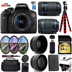 Product Highlights: 24.2MP APS-C CMOS Sensor DIGIC 6 Image Processor 3.0" 1.04m-dot Vari-Angle Touchscreen Full HD 1080p Video Recording at 30 fps 19-Pt. Cross-Type AF, Hybrid CMOS AF III Expanded ISO 25600, 5 fps Shooting 7560-Pixel RGB+IR Metering Sensor EOS Scene Analysis Built-In Wi-Fi Connectivity with NFC Canon Rebel T6i Overview: Packing a high resolution 24.2-megapixel CMOS sensor and the DIGIC 6 Image Processor into a compact body is the EOS Rebel T6i DSLR Camera from Canon. This system enables shooting in a wide variety of conditions, from bright sunlight to dim indoor scenarios due to ISO performance of up to 12,800, which can be expanded to 25,600. Bundle Includes: Canon EOS Rebel T6i DSLR Camera Canon EF-S 18-55mm f/3.5-5.6 IS STM Lens Canon EF-S 55-250mm IS STM Lens Multi-Coated 3 Piece Filter Kit (UV-CPL-FLD) 0.43x High Definition Wide Angle Conversion Lens 2.2x Telephoto Conversion Lens 64GB SDXC Class 10 Secure Digital High Speed Memory Card Deluxe Digital Camera/Video Padded Carrying Case Flexible Tripod Lens Cap Keeper High-Speed Card Reader Lens Tissue Paper Cotton Swabs Lens Cleaning Solution 6 Ave MicroFiber Cloth In the Box: LP-E17 Battery Pack LC-E17 Charger Eyecup EF RF-3 Body Cap EW-300D Wide Strap Brand New. Includes Manufacturer's Supplied Accessories & One Year Seller Supplied Warranty.