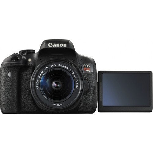 Packing a high resolution 24.2-megapixel CMOS sensor and the DIGIC 6 Image Processor into a compact body is the EOS Rebel T6i DSLR Camera with 18-55mm Lens from Canon, which includes a versatile standard zoom lens useful for stills and video. This system enables shooting in a wide variety of conditions, from bright sunlight to dim indoor scenarios due to ISO performance of up to 12,800, which can be expanded to 25,600. The APS-C camera also has built-in Wi-Fi connectivity with NFC that allows for wireless transfer of images and video to social networks and cloud storage via the Camera Connect mobile app. Also, NFC enables fast connection to mobile devices as well as the CS100 Connect Station. Full HD video in MP4 format is possible with the T6i in addition to stills and it has Hybrid CMOS AF III for fast, accurate autofocus during movie shooting and during Live View. A vari-angle 3.0" 1.04M-dot ClearView II touchscreen LCD monitor on the rear of the camera allows for versatile positioning of the camera and clear viewing, even outdoors. Additionally, the EOS scene analysis system can detect near-infrared light and flickering light sources to provide the best information for metering the scene. Bundle Items Include:Canon EOS Rebel T6i DSLR Camera with 18-55mm LensEF-S 18-55mm f/3.5-5.6 IS STM LensEyecup Ef for Digital Rebel CamerasRF-3 Body Cap for Canon EOS CamerasEW-300D Wide StrapLP-E17 Battery PackLC-E17 Charger for LP-E17 Battery PackIFC-130U Interface CableEOS DIGITAL Solution Disc58MM Wide Angle Lens58MM 3Pc Filter KitLens Cleaning Kit58mm Tulip Lens HoodMicrofiber Cloth
