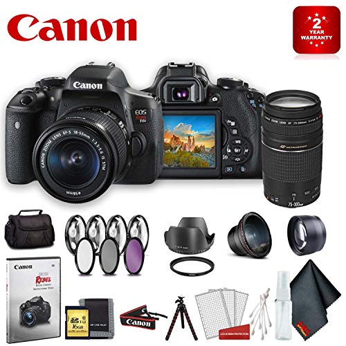 Packing a high resolution 24.2-megapixel CMOS sensor and the DIGIC 6 Image Processor into a compact body is the EOS Rebel T6i DSLR Camera with 18-55mm Lens from Canon, which includes a versatile standard zoom lens useful for stills and video. This system enables shooting in a wide variety of conditions, from bright sunlight to dim indoor scenarios due to ISO performance of up to 12,800, which can be expanded to 25,600. The APS-C camera also has built-in Wi-Fi connectivity with NFC that allows for wireless transfer of images and video to social networks and cloud storage via the Camera Connect mobile app. Also, NFC enables fast connection to mobile devices as well as the CS100 Connect Station. CPS warranty replaces manufacturer warranty.What's In The Box:1 x Canon EOS Rebel T6i DSLR Camera with 18-55mm Lens1 x EF-S 18-55mm f/3.5-5.6 IS STM Lens1 x Eyecup EF1 x RF-3 Body Cap for Canon EOS Cameras1 x EW-300D Wide Strap1 x LP-E17 Battery Pack1 x LC-E17 Charger for LP-E17 Battery Pack1 x IFC-130U Interface Cable1 x EOS DIGITAL Solution DiscIncluded In This Bundle:1 x Canon EF 75-300mm f/4-5.6 III USM Lens1 x SanDisk 16GB Ultra UHS-I SDHC Class 101 x Memory Card Wallet1 x 58mm Tulip Lens Hood1 x Professional 3 Piece 58mm Filter Kit1 x 8mm Close Up Filter Set (Diopters +1 +2 +4 +10)1 x Step Ring 58-52mm 1 x 58mm Professional Telephoto Lens 1 x 58mm Professional Wide Angle Lens1 x Case for Camera 1 x Instructional Video for Canon EOS Rebel Digital Cameras1 x Microfiber Cloth1 x Lens Cleaning Kit w/ Tripod 1 x 2 Year Warranty