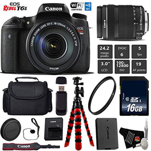 Product Highlights: 24.2MP APS-C CMOS Sensor DIGIC 6 Image Processor 3.0" 1.04m-dot Vari-Angle Touchscreen Full HD 1080p Video Recording at 30 fps 19-Pt. Cross-Type AF, Hybrid CMOS AF III Expanded ISO 25600, 5 fps Shooting 7560-Pixel RGB+IR Metering Sensor EOS Scene Analysis Built-In Wi-Fi Connectivity with NFC Canon Rebel T6s Overview: Adding much more control over previous models, the EOS Rebel T6s DSLR Camera from Canon is the first of its class to feature a top LCD panel, a Quick Control dial, and horizontal level. This camera also packs a high resolution 24.2-megapixel CMOS sensor and the DIGIC 6 Image Processor into a compact body, enabling shooting in a wide variety of conditions, from bright sunlight to dim indoor scenarios due to ISO performance of up to 12,800, which can be expanded to 25,600. Bundle Includes: Canon EOS Rebel T6s DSLR Camera Canon EF-S 18-135mm f/3.5-5.6 IS STM Lens UV Protection Filter 16GB SDXC Class 10 Secure Digital High Speed Memory Card Deluxe Digital Camera/Video Padded Carrying Case Flexible Tripod Lens Cap Keeper High-Speed Card Reader Lens Tissue Paper Cotton Swabs Lens Cleaning Solution 6 Ave MicroFiber Cloth In the Box: LP-E17 Battery Pack LC-E17 Charger Eyecup EF RF-3 Body Cap EW-100DBV Wide StrapIFC-130U Interface CableEOS DIGITAL Solution Disc Brand New. Includes Manufacturer's Supplied Accessories & One Year Seller Supplied Warranty.