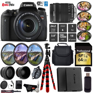 Product Highlights: 24.2MP APS-C CMOS Sensor DIGIC 6 Image Processor 3.0" 1.04m-dot Vari-Angle Touchscreen Full HD 1080p Video Recording at 30 fps 19-Pt. Cross-Type AF, Hybrid CMOS AF III Expanded ISO 25600, 5 fps Shooting 7560-Pixel RGB+IR Metering Sensor Canon Rebel T6s Overview: Adding much more control over previous models, the EOS Rebel T6s DSLR Camera from Canon is the first of its class to feature a top LCD panel, a Quick Control dial, and horizontal level. This camera also packs a high resolution 24.2-megapixel CMOS sensor and the DIGIC 6 Image Processor into a compact body, enabling shooting in a wide variety of conditions, from bright sunlight to dim indoor scenarios due to ISO performance of up to 12,800, which can be expanded to 25,600. Bundle Includes: Canon EOS Rebel T6s DSLR Camera Canon EF-S 18-135mm f/3.5-5.6 IS STM Lens Multi-Coated 3 Piece Filter Kit (UV-CPL-FLD) 4PC Macro Filter Set (+1,+2,+4,+10) 0.43x High Definition Wide Angle Conversion Lens 2.2x Telephoto Conversion Lens 64GB SDXC Class 10 Secure Digital High Speed Memory Card Replacement Battery For LP-E17 Lithium-Ion Battery Pack Carrying Case Flexible Tripod Wrist Strap Lens Cap Keeper High-Speed Card Reader Lens Tissue Paper Cotton Swabs Lens Cleaning Solution 6 Ave MicroFiber Cloth In the Box: LP-E17 Battery Pack LC-E17 Charger Eyecup EF RF-3 Body Cap EW-100DBV Wide StrapIFC-130U Interface CableEOS DIGITAL Solution Disc Brand New. Includes Manufacturer's Supplied Accessories & One Year Seller Supplied Warranty.