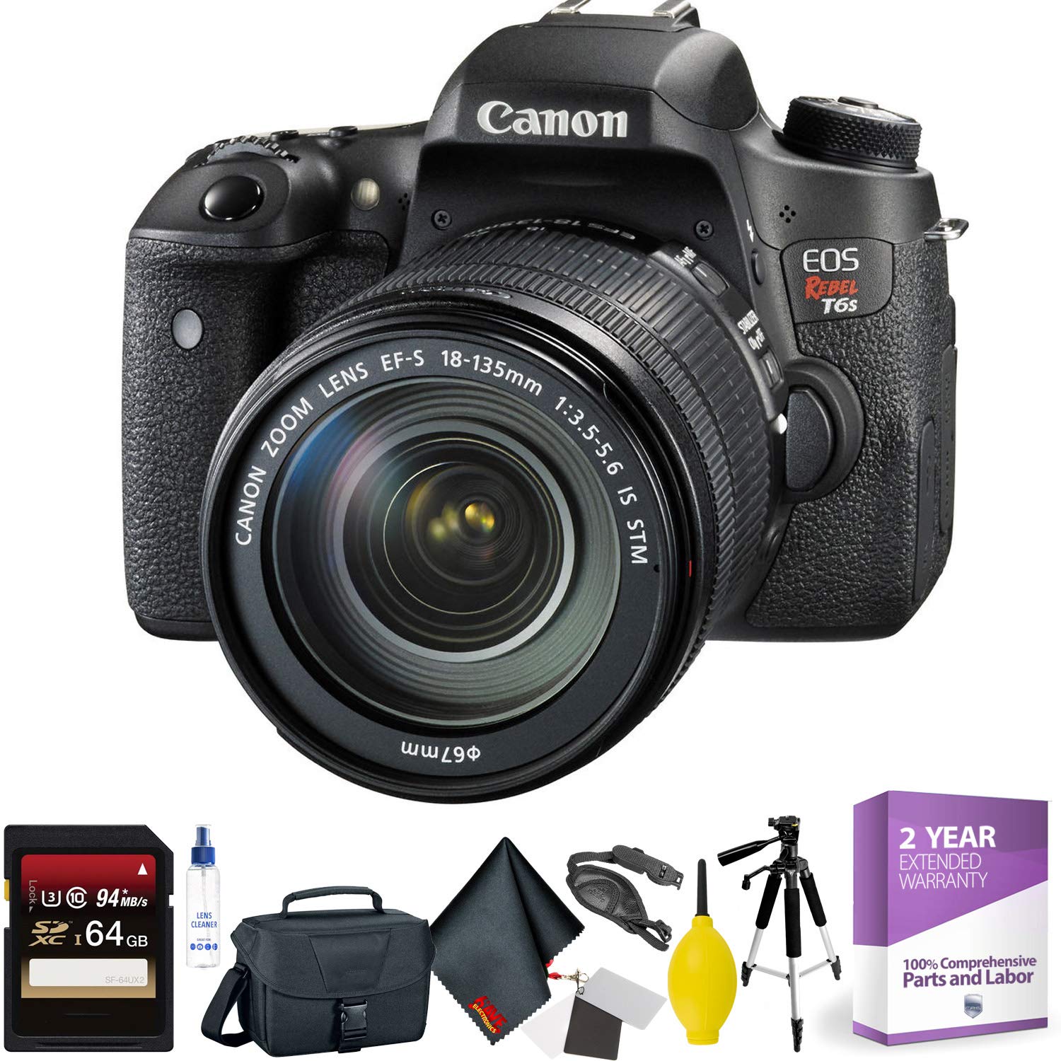 Canon EOS Rebel T6s DSLR Camera with 18-135mm Lens Overview:Adding much more control over previous models, the EOS Rebel T6s DSLR Camera with 18-135mm Lens from Canon is the first of its class to feature a top LCD panel, a Quick Control dial, and horizontal level. This camera packs a high resolution 24.2-megapixel CMOS sensor and the DIGIC 6 Image Processor into a compact body, and it comes with a versatile standard to telephoto zoom lens, enabling shooting in a wide variety of conditions, from bright sunlight to dim indoor scenarios due to ISO performance of up to 12,800, which can be expanded to 25,600. The APS-C camera has built-in Wi-Fi connectivity with NFC that allows for wireless transfer of images and video to social networks and cloud storage via the Camera Connect mobile app. Also, NFC enables fast connection to mobile devices as well as the CS100 Connect Station.24.2 MP APS-C CMOS SensorDIGIC 6 Image Processor3.0" 1.04m-dot Vari-Angle TouchscreenFull HD 1080p Video Recording at 30 fpsWhat's In The Box:Canon EOS Rebel T6s DSLR Camera with 18-135mm Lens EF-S 18-135mm f/3.5-5.6 IS STM Lens Eyecup Ef for Digital Rebel Cameras Body CapEW-100DBV Wide Strap LP-E17 Battery Pack LC-E17 Charger for LP-E17 Battery Pack IFC-130U Interface Cable EOS DIGITAL Solution Disc Limited 1-Year Warranty Items Included With Your Purchase:1 x 64GB Memory Card1 x SD Card Reader1 x Fibercloth1 x Camera Cleaning Kit1 x Memory Card Wallet1 X Lens Cap Keeper1 x Tripod1 x Dust Blower1 x Handstrap1 x Set of White Balance Cards