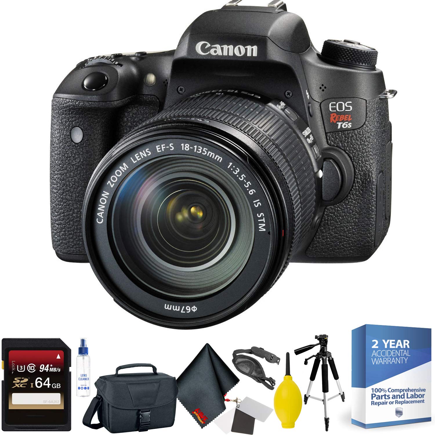 Canon EOS Rebel T6s DSLR Camera with 18-135mm Lens Overview:Adding much more control over previous models, the EOS Rebel T6s DSLR Camera with 18-135mm Lens from Canon is the first of its class to feature a top LCD panel, a Quick Control dial, and horizontal level. This camera packs a high resolution 24.2-megapixel CMOS sensor and the DIGIC 6 Image Processor into a compact body, and it comes with a versatile standard to telephoto zoom lens, enabling shooting in a wide variety of conditions, from bright sunlight to dim indoor scenarios due to ISO performance of up to 12,800, which can be expanded to 25,600. The APS-C camera has built-in Wi-Fi connectivity with NFC that allows for wireless transfer of images and video to social networks and cloud storage via the Camera Connect mobile app. Also, NFC enables fast connection to mobile devices as well as the CS100 Connect Station.24.2 MP APS-C CMOS SensorDIGIC 6 Image Processor3.0" 1.04m-dot Vari-Angle TouchscreenFull HD 1080p Video Recording at 30 fpsWhat's In The Box:Canon EOS Rebel T6s DSLR Camera with 18-135mm Lens EF-S 18-135mm f/3.5-5.6 IS STM Lens Eyecup Ef for Digital Rebel Cameras Body CapEW-100DBV Wide Strap LP-E17 Battery Pack LC-E17 Charger for LP-E17 Battery Pack IFC-130U Interface Cable EOS DIGITAL Solution Disc Limited 1-Year Warranty Items Included With Your Purchase:1 x 64GB Memory Card1 x SD Card Reader1 x Fibercloth1 x Camera Cleaning Kit1 x Memory Card Wallet1 X Lens Cap Keeper1 x Tripod1 x Dust Blower1 x Handstrap1 x Set of White Balance CardsSpecial 2 Year Warranty Covering Accidents, Parts, and Labor