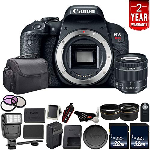 Packing a versatile feature-set in a sleek and portable body, the EOS Rebel T7i DSLR from Canon offers advanced imaging capabilities along with a convenient range of controls and connectivity. Utilizing a 24.2MP APS-C CMOS sensor and DIGIC 7 image processor, the Rebel T7i is able to capture high-resolution stills and video with an expanded sensitivity range of ISO 100-51200 to suit working in a wide variety of lighting conditions. Included with the camera body is the EF-S 18-55mm f/4-5.6 IS STM lens, which provides a 28.8-88mm equivalent focal length range that covers a variety of perspectives from wide-angle to portrait-length. Its design integrates an STM focusing mechanism that provides near-silent focusing abilities with smooth and precise control. Manufacturer Included Items: Canon EOS Rebel T7i DSLR Camera with 18-55mm Lens EF-S 18-55mm f/4-5.6 IS STM Lens LP-E17 Lithium-Ion Battery Pack LC-E17 Charger for LP-E17 Battery Pack Eyecup EF RF-3 Body Cap for Canon EOS Cameras EW-400D Wide Strap Items Included in 64GB Memory Bundle: 2 Year Seller Warranty (Replaces Manufacturer Warranty) Replacement Battery for Canon LPE17 Travel Charger for Canon LPE17 Wide Angle Lens Telephoto Lens 2x 32GB SDHC Class 10 Memory Cards Memory Card Wallet 3 Piece Filter Kit Includes: UV, Circular Polarizer and Fluorescent Filter and Hard Case Soft Carrying Case Wireless Remote- Universal Digital Slave Flash 5 piece Lens Cleaning Kit;(Microfiber Cloth, Lens Cleaning Fluid, 5pc Cotton Swabs, Blower Brush Lens Tissue Paper) Microfiber Cleaning Cloth