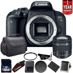 Packing a versatile feature-set in a sleek and portable body, the EOS Rebel T7i DSLR from Canon offers advanced imaging capabilities along with a convenient range of controls and connectivity. Utilizing a 24.2MP APS-C CMOS sensor and DIGIC 7 image processor, the Rebel T7i is able to capture high-resolution stills and video with an expanded sensitivity range of ISO 100-51200 to suit working in a wide variety of lighting conditions. Included with the camera body is the EF-S 18-55mm f/4-5.6 IS STM lens, which provides a 28.8-88mm equivalent focal length range that covers a variety of perspectives from wide-angle to portrait-length. Its design integrates an STM focusing mechanism that provides near-silent focusing abilities with smooth and precise control. Manufacturer Included Items: Canon EOS Rebel T7i DSLR Camera with 18-55mm Lens EF-S 18-55mm f/4-5.6 IS STM Lens LP-E17 Lithium-Ion Battery Pack LC-E17 Charger for LP-E17 Battery Pack Eyecup EF RF-3 Body Cap for Canon EOS Cameras EW-400D Wide Strap Items Included in 32GB Memory Bundle: 1 Year Seller Warranty (Replaces Manufacturer Warranty) 32GB SDHC Class 10 Memory Card Memory Card Wallet Professional UV Filter Soft Carrying Case 5 piece Lens Cleaning Kit;(Microfiber Cloth, Lens Cleaning Fluid, 5pc Cotton Swabs, Blower Brush Lens Tissue Paper) Microfiber Cleaning Cloth