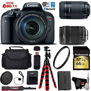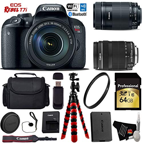 Product Highlights: 24.2MP APS-C CMOS Sensor DIGIC 7 Image Processor 3.0" 1.04m-Dot Vari-Angle Touchscreen Full HD 1080p Video Recording at 60 fps 45-Point All Cross-Type Phase-Detect AF Dual Pixel CMOS AF Up to 6 fps Shooting and ISO 51200 Built-In Wi-Fi with NFC, Bluetooth HDR Movie and Time-Lapse Movie EF-S 18-135mm f/3.5-5.6 IS STM Lens Canon Rebel T7i Overview: Packing a versatile feature-set in a sleek and portable body, the EOS Rebel T7i DSLR from Canon offers advanced imaging capabilities along with a convenient range of controls and connectivity. Bundle Includes: Canon EOS Rebel T7i DSLR Camera Canon EF-S 18-135mm f/3.5-5.6 IS STM Lens Canon EF-S 55-250mm IS STM Lens UV Protection Filter 64GB SDXC Class 10 Secure Digital High Speed Memory Card Deluxe Digital Camera/Video Padded Carrying Case Flexible Tripod Lens Cap Keeper High-Speed Card Reader Lens Tissue Paper Cotton Swabs Lens Cleaning Solution 6 Ave MicroFiber Cloth In the Box: LP-E17 Battery Pack LC-E17 Charger Eyecup EF RF-3 Body Cap EW-400D Wide Strap Brand New. Includes Manufacturer's Supplied Accessories & One Year Seller Supplied Warranty.