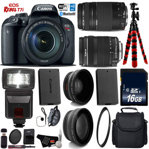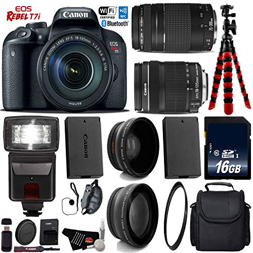 Product Highlights: 24.2MP APS-C CMOS Sensor DIGIC 7 Image Processor 3.0" 1.04m-Dot Vari-Angle Touchscreen Full HD 1080p Video Recording at 60 fps 45-Point All Cross-Type Phase-Detect AF Dual Pixel CMOS AF Up to 6 fps Shooting and ISO 51200 Built-In Wi-Fi with NFC, Bluetooth HDR Movie and Time-Lapse Movie EF-S 18-135mm f/3.5-5.6 IS STM Lens Canon Rebel T7i Overview: Packing a versatile feature-set in a sleek and portable body, the EOS Rebel T7i DSLR from Canon offers advanced imaging capabilities along with a convenient range of controls and connectivity. Bundle Includes: Canon EOS Rebel T7i DSLR Camera Canon EF-S 18-135mm f/3.5-5.6 IS STM Lens Canon EF 75-300mm f/4-5.6 III Lens Replacement Battery For LP-E17 Lithium-Ion Battery Pack Professional Flash UV Protection Lens 0.43x High Definition Wide Angle Conversion Lens 2.2x Telephoto Conversion Lens 16GB SDXC Class 10 Secure Digital High Speed Memory Card Wrist Strap Deluxe Digital Camera/Video Padded Carrying Case Flexible Tripod Lens Cap Keeper High-Speed Card Reader Lens Tissue Paper Cotton Swabs Lens Cleaning Solution 6 Ave MicroFiber Cloth In the Box: LP-E17 Battery Pack LC-E17 Charger Eyecup EF RF-3 Body Cap EW-400D Wide Strap Brand New. Includes Manufacturer's Supplied Accessories & One Year Seller Supplied Warranty.