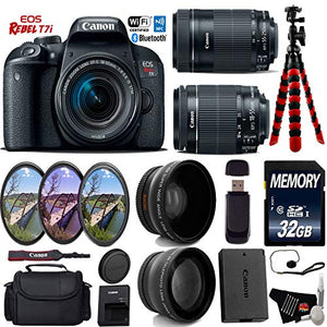 Product Highlights: 24.2MP APS-C CMOS Sensor DIGIC 7 Image Processor 3.0" 1.04m-Dot Vari-Angle Touchscreen Full HD 1080p Video Recording at 60 fps 45-Point All Cross-Type Phase-Detect AF Dual Pixel CMOS AF Up to 6 fps Shooting and ISO 51200 Built-In Wi-Fi with NFC, Bluetooth HDR Movie and Time-Lapse Movie EF-S 18-55mm f/4-5.6 IS STM Lens Canon Rebel T7i Overview: Packing a versatile feature-set in a sleek and portable body, the EOS Rebel T7i DSLR from Canon offers advanced imaging capabilities along with a convenient range of controls and connectivity. Bundle Includes: Canon EOS Rebel T7i DSLR Camera Canon EF-S 18-55mm f/3.5-5.6 IS STM Lens Canon EF-S 55-250mm IS STM Lens Multi-Coated 3 Piece Filter Kit (UV-CPL-FLD) 0.43x High Definition Wide Angle Conversion Lens 2.2x Telephoto Conversion Lens 32GB SDXC Class 10 Secure Digital High Speed Memory Card Deluxe Digital Camera/Video Padded Carrying Case Flexible Tripod Lens Cap Keeper High-Speed Card Reader Lens Tissue Paper Cotton Swabs Lens Cleaning Solution 6 Ave MicroFiber Cloth In the Box: LP-E17 Battery Pack LC-E17 Charger Eyecup EF RF-3 Body Cap EW-400D Wide Strap Brand New. Includes Manufacturer's Supplied Accessories & One Year Seller Supplied Warranty.