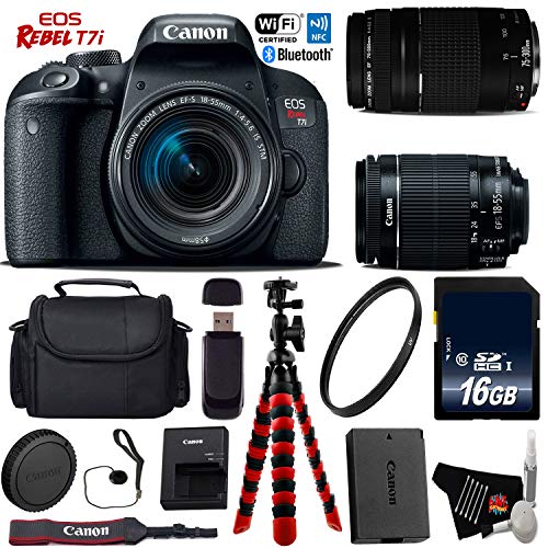 Product Highlights: 24.2MP APS-C CMOS Sensor DIGIC 7 Image Processor 3.0" 1.04m-Dot Vari-Angle Touchscreen Full HD 1080p Video Recording at 60 fps 45-Point All Cross-Type Phase-Detect AF Dual Pixel CMOS AF Up to 6 fps Shooting and ISO 51200 Built-In Wi-Fi with NFC, Bluetooth HDR Movie and Time-Lapse Movie EF-S 18-55mm f/4-5.6 IS STM Lens Canon Rebel T7i Overview: Packing a versatile feature-set in a sleek and portable body, the EOS Rebel T7i DSLR from Canon offers advanced imaging capabilities along with a convenient range of controls and connectivity. Bundle Includes: Canon EOS Rebel T7i DSLR Camera Canon EF-S 18-55mm f/3.5-5.6 IS STM Lens Canon EF 75-300mm f/4-5.6 III Lens UV Protection Filter 16GB SDXC Class 10 Secure Digital High Speed Memory Card Deluxe Digital Camera/Video Padded Carrying Case Flexible Tripod Lens Cap Keeper High-Speed Card Reader Lens Tissue Paper Cotton Swabs Lens Cleaning Solution 6 Ave MicroFiber Cloth In the Box: LP-E17 Battery Pack LC-E17 Charger Eyecup EF RF-3 Body Cap EW-400D Wide Strap Brand New. Includes Manufacturer's Supplied Accessories & One Year Seller Supplied Warranty.