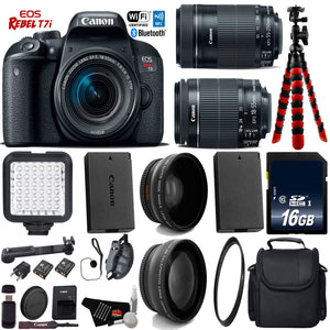 Product Highlights: 24.2MP APS-C CMOS Sensor DIGIC 7 Image Processor 3.0" 1.04m-Dot Vari-Angle Touchscreen Full HD 1080p Video Recording at 60 fps 45-Point All Cross-Type Phase-Detect AF Dual Pixel CMOS AF Up to 6 fps Shooting and ISO 51200 Built-In Wi-Fi with NFC, Bluetooth HDR Movie and Time-Lapse Movie EF-S 18-55mm f/4-5.6 IS STM Lens Canon Rebel T7i Overview: Packing a versatile feature-set in a sleek and portable body, the EOS Rebel T7i DSLR from Canon offers advanced imaging capabilities along with a convenient range of controls and connectivity. Bundle Includes: Canon EOS Rebel T7i DSLR Camera Canon EF-S 18-55mm f/3.5-5.6 IS STM Lens Canon EF-S 55-250mm IS STM Lens Replacement Battery For LP-E17 Lithium-Ion Battery Pack LED Camera Video Light Continuous Panel Light On Camera UV Protection Lens 0.43x High Definition Wide Angle Conversion Lens 2.2x Telephoto Conversion Lens 16GB SDXC Class 10 Secure Digital High Speed Memory Card Wrist Strap Deluxe Digital Camera Case Flexible Tripod Lens Cap Keeper High-Speed Card Reader Lens Tissue Paper Cotton Swabs Lens Cleaning Solution 6 Ave MicroFiber Cloth In the Box: LP-E17 Battery Pack LC-E17 Charger Eyecup EF RF-3 Body Cap EW-400D Wide Strap Brand New. Includes Manufacturer's Supplied Accessories & One Year Seller Supplied Warranty.