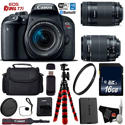 Product Highlights: 24.2MP APS-C CMOS Sensor DIGIC 7 Image Processor 3.0" 1.04m-Dot Vari-Angle Touchscreen Full HD 1080p Video Recording at 60 fps 45-Point All Cross-Type Phase-Detect AF Dual Pixel CMOS AF Up to 6 fps Shooting and ISO 51200 Built-In Wi-Fi with NFC, Bluetooth HDR Movie and Time-Lapse Movie EF-S 18-55mm f/4-5.6 IS STM Lens Canon Rebel T7i Overview: Packing a versatile feature-set in a sleek and portable body, the EOS Rebel T7i DSLR from Canon offers advanced imaging capabilities along with a convenient range of controls and connectivity. Bundle Includes: Canon EOS Rebel T7i DSLR Camera Canon EF-S 18-55mm f/3.5-5.6 IS STM Lens Canon EF-S 55-250mm IS STM Lens UV Protection Filter 16GB SDXC Class 10 Secure Digital High Speed Memory Card Deluxe Digital Camera/Video Padded Carrying Case Flexible Tripod Lens Cap Keeper High-Speed Card Reader Lens Tissue Paper Cotton Swabs Lens Cleaning Solution 6 Ave MicroFiber Cloth In the Box: LP-E17 Battery Pack LC-E17 Charger Eyecup EF RF-3 Body Cap EW-400D Wide Strap Brand New. Includes Manufacturer's Supplied Accessories & One Year Seller Supplied Warranty.