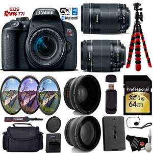 Product Highlights: 24.2MP APS-C CMOS Sensor DIGIC 7 Image Processor 3.0" 1.04m-Dot Vari-Angle Touchscreen Full HD 1080p Video Recording at 60 fps 45-Point All Cross-Type Phase-Detect AF Dual Pixel CMOS AF Up to 6 fps Shooting and ISO 51200 Built-In Wi-Fi with NFC, Bluetooth HDR Movie and Time-Lapse Movie EF-S 18-55mm f/4-5.6 IS STM Lens Canon Rebel T7i Overview: Packing a versatile feature-set in a sleek and portable body, the EOS Rebel T7i DSLR from Canon offers advanced imaging capabilities along with a convenient range of controls and connectivity. Bundle Includes: Canon EOS Rebel T7i DSLR Camera Canon EF-S 18-55mm f/3.5-5.6 IS STM Lens Canon EF-S 55-250mm IS STM Lens Multi-Coated 3 Piece Filter Kit (UV-CPL-FLD) 0.43x High Definition Wide Angle Conversion Lens 2.2x Telephoto Conversion Lens 64GB SDXC Class 10 Secure Digital High Speed Memory Card Deluxe Digital Camera/Video Padded Carrying Case Flexible Tripod Lens Cap Keeper High-Speed Card Reader Lens Tissue Paper Cotton Swabs Lens Cleaning Solution 6 Ave MicroFiber Cloth In the Box: LP-E17 Battery Pack LC-E17 Charger Eyecup EF RF-3 Body Cap EW-400D Wide Strap Brand New. Includes Manufacturer's Supplied Accessories & One Year Seller Supplied Warranty.