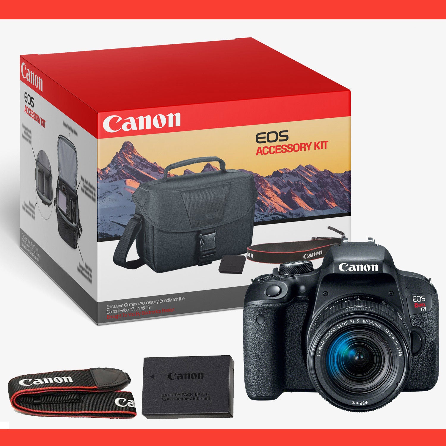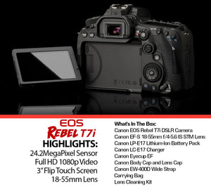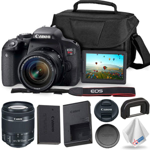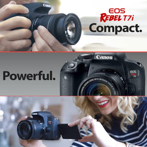 - INCLUDED WITH YOUR PURCHASE: Canon Rebel T7i, 18-55mm Lens, Canon Neck Strap, Battery, Battery Charger, Cleaning Cloth, Camera Bag, Eyepiece, Body Cap and a 1 Year USA Warranty from Canon!