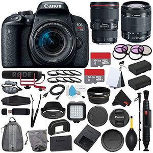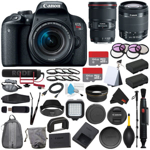 Product Highlights: 24.2MP APS-C CMOS Sensor DIGIC 7 Image Processor 3.0" 1.04m-Dot Vari-Angle Touchscreen Full HD 1080p Video Recording at 60 fps 45-Point All Cross-Type Phase-Detect AF Dual Pixel CMOS AF Up to 6 fps Shooting and ISO 51200 Built-In Wi-Fi with NFC, Bluetooth HDR Movie and Time-Lapse Movie EF-S 18-55mm f/4-5.6 IS STM Lens This 6AVE Bundle includes: 1- Canon EOS Rebel T7i DSLR Camera with 18-55mm Lens1- Canon EF 16-35mm f/4L IS USM Lens1- Rode VideoMic GO1- 58mm 0.45x Wide Angle Lens w/ Pouch and Caps (Capture That View!)1- 58mm 3 Piece Filter Kit Includes: UV, Circular Polarizer and Flourescent Filter and Hard Case1- 58mm +1 +2 +4 +10 Close-Up Macro Filter Set with Pouch (More Macro with ANY Lens!)1- 77mm 3 Piece Filter Kit Includes: UV, Circular Polarizer and Flourescent Filter and Hard Case1- 77mm +1 +2 +4 +10 Close-Up Macro Filter Set with Pouch (More Macro with ANY Lens!)2- LP-E17 Lithium Ion Replacement Rechargeable Battery (Not Original Canon)(Don't Miss out on a Memory!)1- Lens Cleaning Solution1- Blower Brush1- Microfiber Cloth1- Lens Tissue Paper1- 5pc Cotton Swabs1- Lens Pen Cleaner1- High Quality Dust Blower1- MicroFiber Cloth 1- SLR/DSLR Pro Hand Camera Grip1- Camera Neck Strap2- SanDisk 64GB Extreme PRO SDXC UHS-I Memory Card1- USB SDHC Card Reader1- 6 Foot High Performance Mini HDMI Cable 1- 70in Monopod1- Universal 3 Piece Digital Grey Balance Cards Set1- Deluxe SLR Backpack (Padded Compartments Carry All Your Gear Safely!)1- LED Video Light w/ Bracket