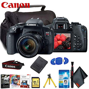 The Canon EOS Rebel T7i DSLR offers advanced imaging capabilities along with a convenient range of controls and connectivity. Utilizing a 24.2MP APS-C CMOS sensor and DIGIC 7 image processor, the Rebel T7i is able to capture high-resolution stills and video with an expanded sensitivity range of ISO 100-51200 to suit working in a wide variety of lighting conditions. The sensor and processor combination also avails 6 fps continuous shooting for working with moving subjects. Benefitting the imaging attributes, the sensor's design also facilitates Dual Pixel CMOS AF, which uses phase-detection autofocus for quick, accurate, and smooth focusing performance when recording movies or shooting stills in live view. When shooting stills using the optical viewfinder, a 45-point all cross-type phase-detection system is used for quick and accurate focusing in a variety of shooting scenarios.What's In The Box:Canon EOS Rebel T7i DSLR Camera with 18-55mm LensEF-S 18-55mm f/4-5.6 IS STM LensLP-E17 Lithium-Ion Battery PackLC-E17 Charger for LP-E17 Battery PackEyecup EFRF-3 Body Cap for Canon EOS CamerasEW-400D Wide StrapLimited 1-Year WarrantyIncluded In This Bundle16GB SDHC Memory CardUSB Card ReaderCamera CaseCorel Mac Photo Essentials Software Kit (Corel AfterShot, Corel Painter Essentials 5, Roxi)12 inch Flexible TripodLens Pen CleanerScreen CleanerMicrofiber Cloth