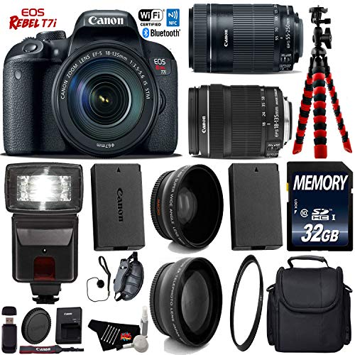 Product Highlights: 24.2MP APS-C CMOS Sensor DIGIC 7 Image Processor 3.0" 1.04m-Dot Vari-Angle Touchscreen Full HD 1080p Video Recording at 60 fps 45-Point All Cross-Type Phase-Detect AF Dual Pixel CMOS AF Up to 6 fps Shooting and ISO 51200 Built-In Wi-Fi with NFC, Bluetooth HDR Movie and Time-Lapse Movie EF-S 18-135mm f/3.5-5.6 IS STM Lens Canon Rebel T7i Overview: Packing a versatile feature-set in a sleek and portable body, the EOS Rebel T7i DSLR from Canon offers advanced imaging capabilities along with a convenient range of controls and connectivity. Bundle Includes: Canon EOS Rebel T7i DSLR Camera Canon EF-S 18-135mm f/3.5-5.6 IS STM Lens Canon EF-S 55-250mm IS STM Lens Replacement Battery For LP-E17 Lithium-Ion Battery Pack Professional Flash UV Protection Lens 0.43x High Definition Wide Angle Conversion Lens 2.2x Telephoto Conversion Lens 32GB SDXC Class 10 Secure Digital High Speed Memory Card Wrist Strap Deluxe Digital Camera/Video Padded Carrying Case Flexible Tripod Lens Cap Keeper High-Speed Card Reader Lens Tissue Paper Cotton Swabs Lens Cleaning Solution 6 Ave MicroFiber Cloth In the Box: LP-E17 Battery Pack LC-E17 Charger Eyecup EF RF-3 Body Cap EW-400D Wide Strap Brand New. Includes Manufacturer's Supplied Accessories & One Year Seller Supplied Warranty.
